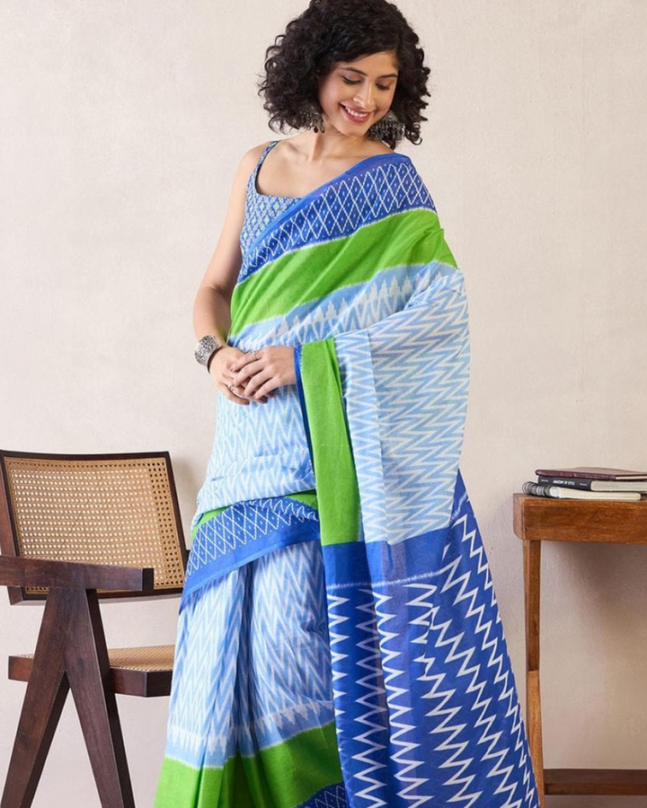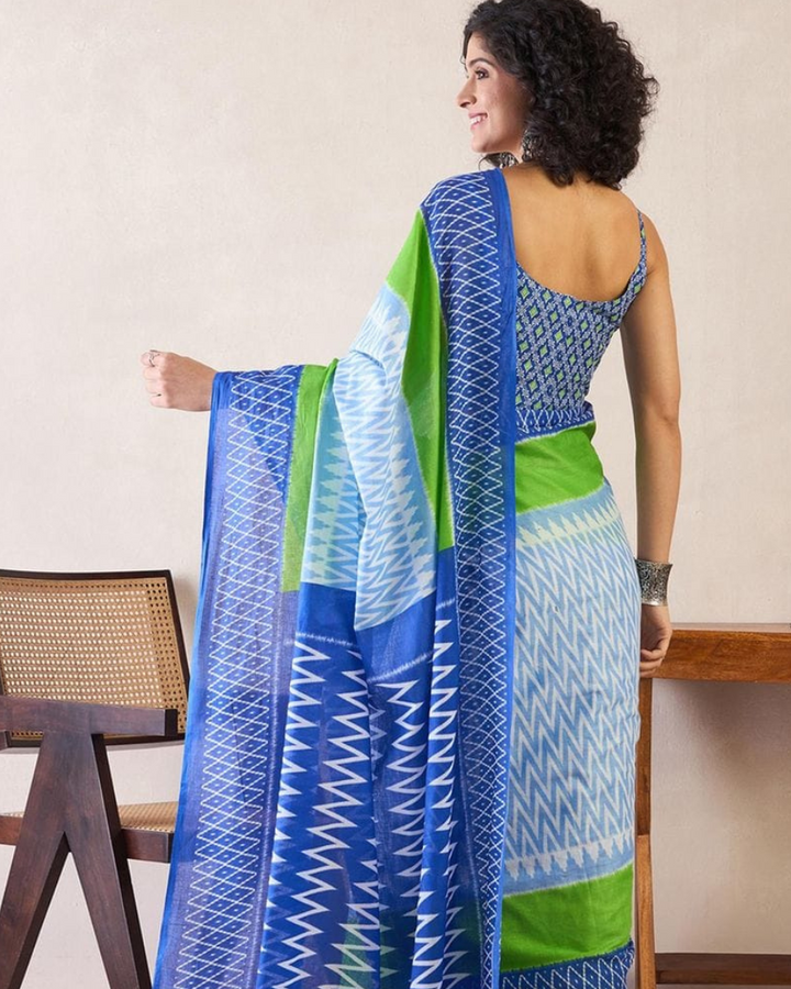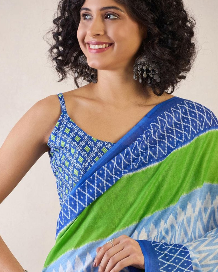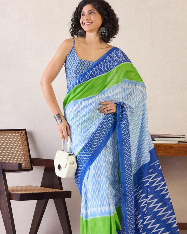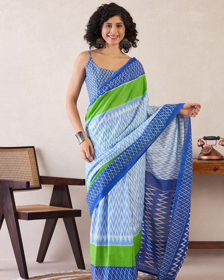 - Blouse Fit: 1. If the blouse is stitched, it is made to fit sizes up to bust 44 inches with a comfortable cut. 2. If the blouse is unstitched, you will receive blouse fabric along with the saree, which can be tailored as per your measurements.