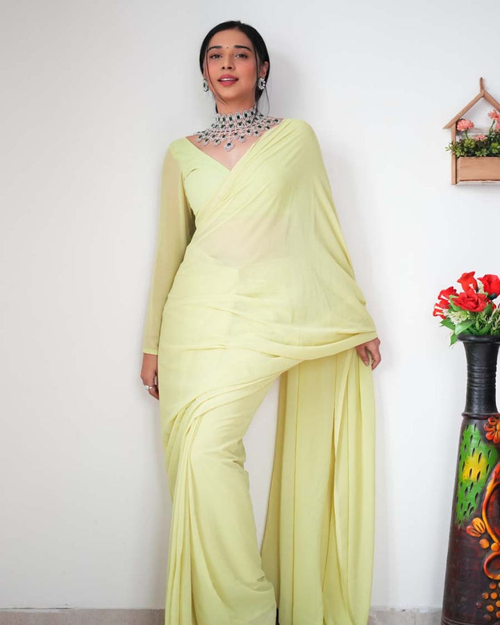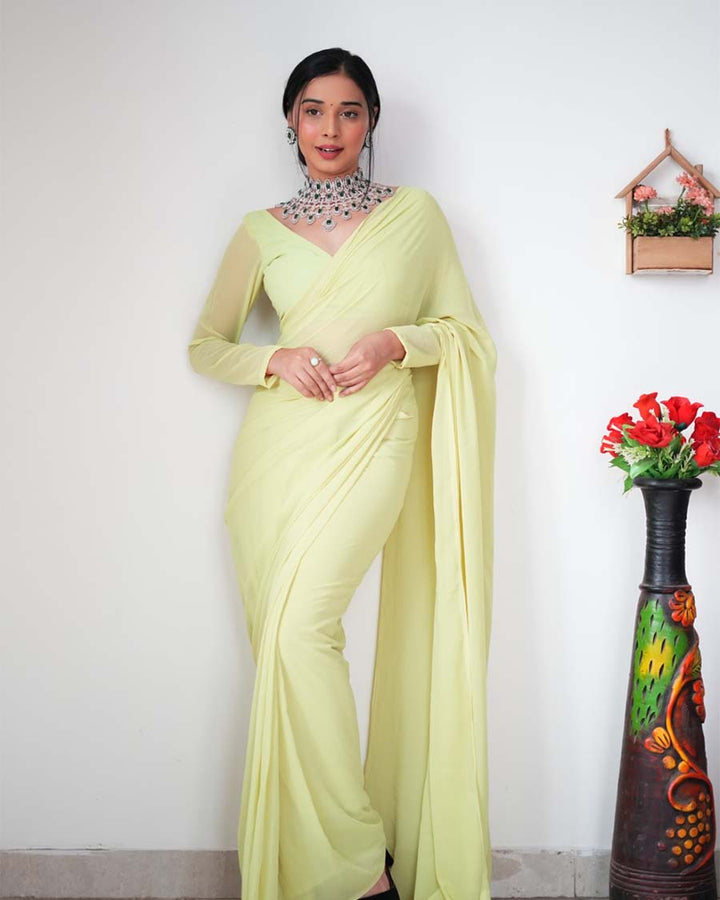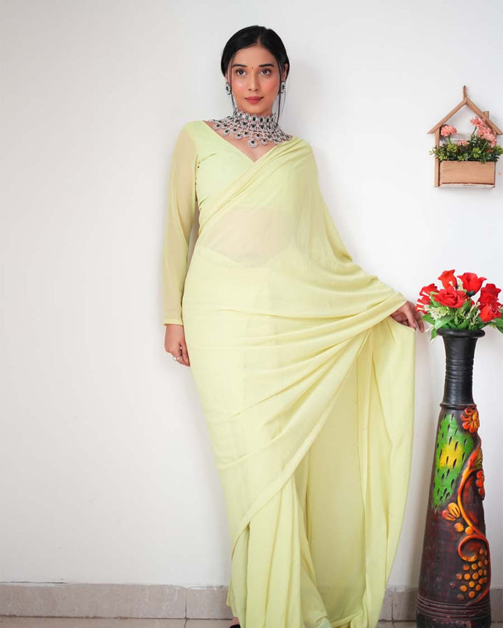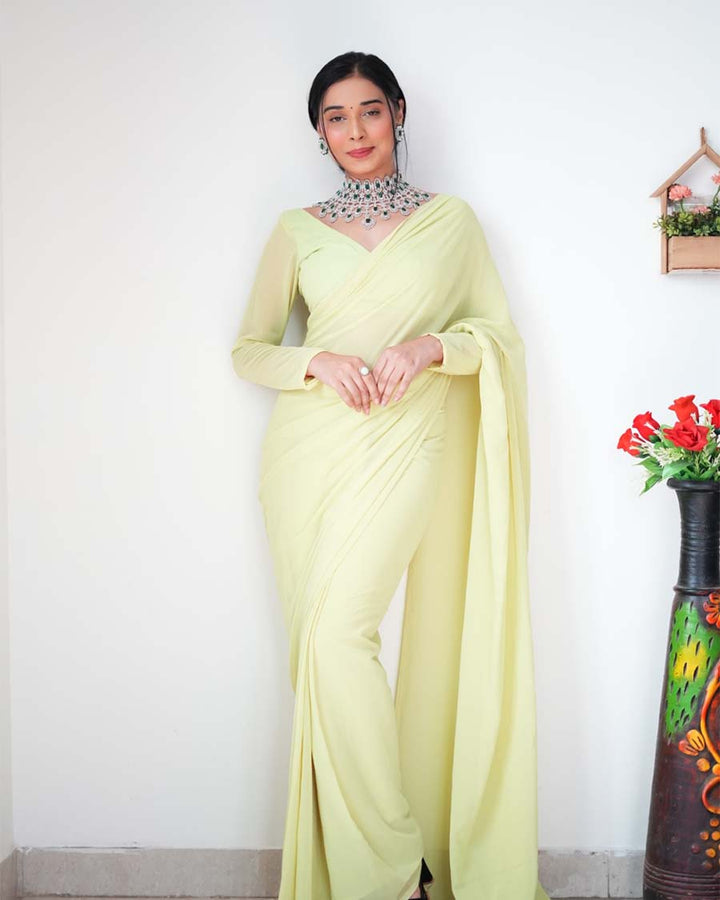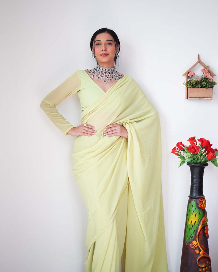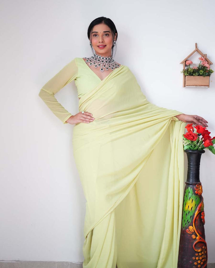 Light Green Color 1-Minute Ready To Wear Georgette Saree With Blouse Piece