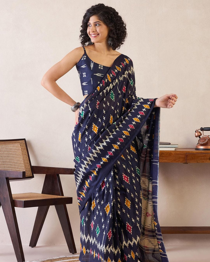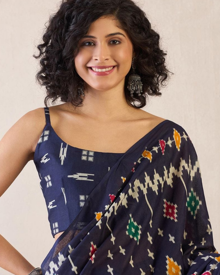 • Blouse Fit: 1. If the blouse is stitched, it is made to fit sizes up to bust 44 inches with a comfortable cut. 2. If the blouse is unstitched, you will receive blouse fabric along with the saree, which can be tailored as per your measurements.
