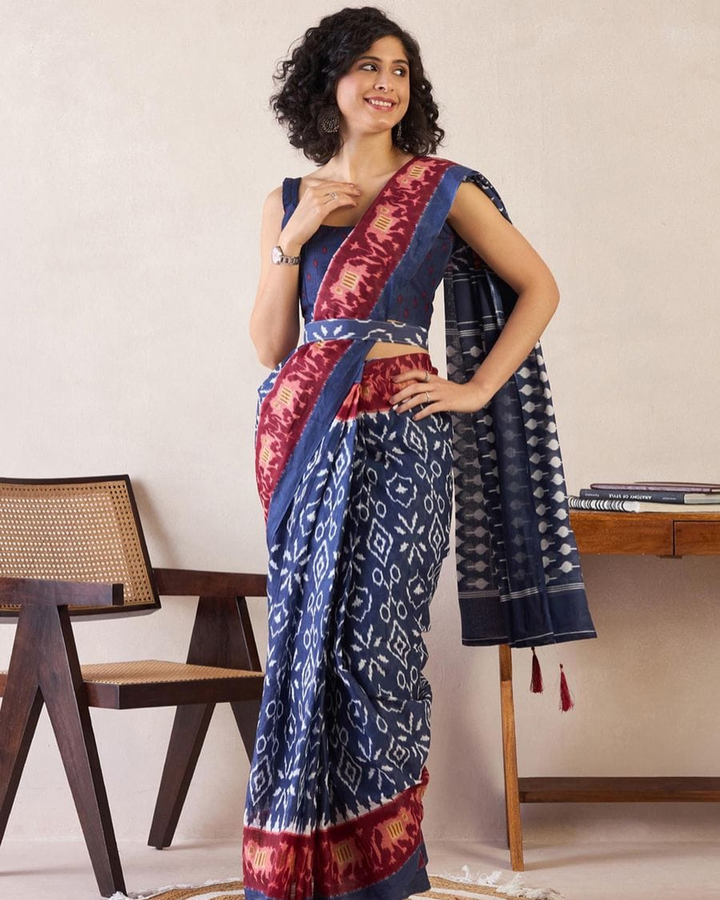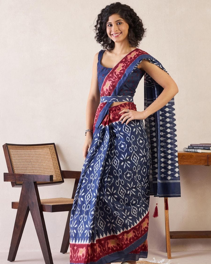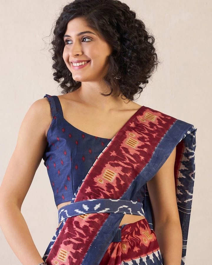 • Blouse Fit: 1. If the blouse is stitched, it is made to fit sizes up to bust 44 inches with a comfortable cut. 2. If the blouse is unstitched, you will receive blouse fabric along with the saree, which can be tailored as per your measurements.